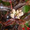 -LIŚCIE: Zimozielone, sztywne i błyszczące, o ząbkowanych brzegach przypominających ostrokrzew; latem są ciemnozielone, natomiast zimą przybierają efektowny, purpurowo-brązowy kolor.