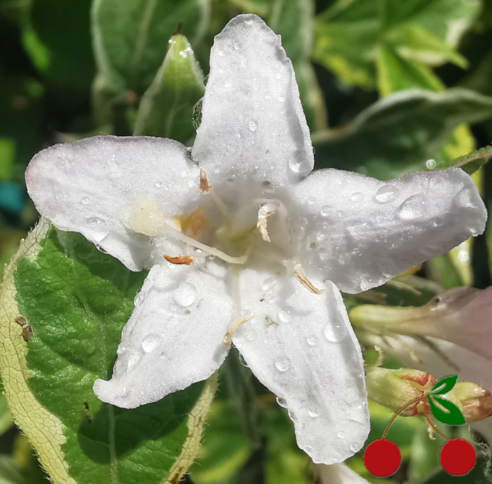 -KWIATY duże, dzwonkowate, długości do 4 cm i średnicy do 3 cm, z zewnątrz o zabarwieniu różowym, wewnątrz jasnoróżowe lub nawet białoróżowe; kwiaty zebrane w kilkunastokwiatowe grona, wyrastające z kątów liści krótkopędów, które wyrastają na zeszłorocznych pędach; kwitnie bardzo obficie od połowy maja do końca czerwca