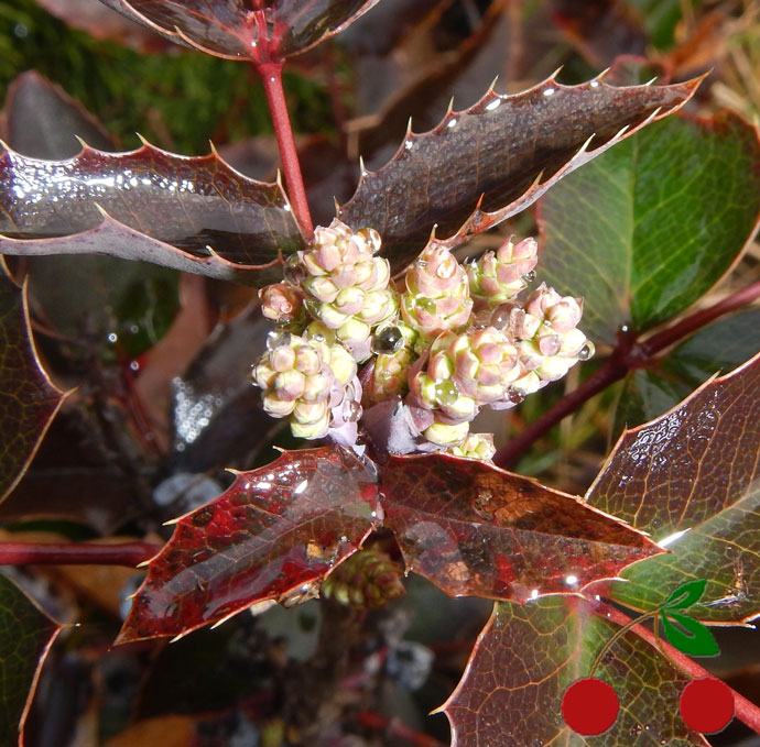 -LIŚCIE: Zimozielone, sztywne i błyszczące, o ząbkowanych brzegach przypominających ostrokrzew; latem są ciemnozielone, natomiast zimą przybierają efektowny, purpurowo-brązowy kolor.