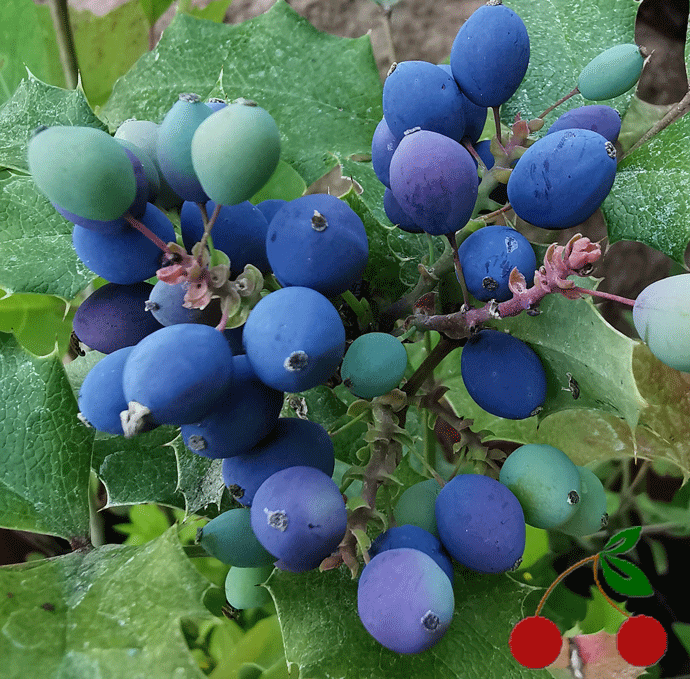 -OWOCE: Kuliste, jadalne jagody o barwie ciemnogranatowej z woskowym, niebieskawym nalotem; dojrzewają we wrześniu i długo utrzymują się na krzewie, zdobiąc go również zimą.