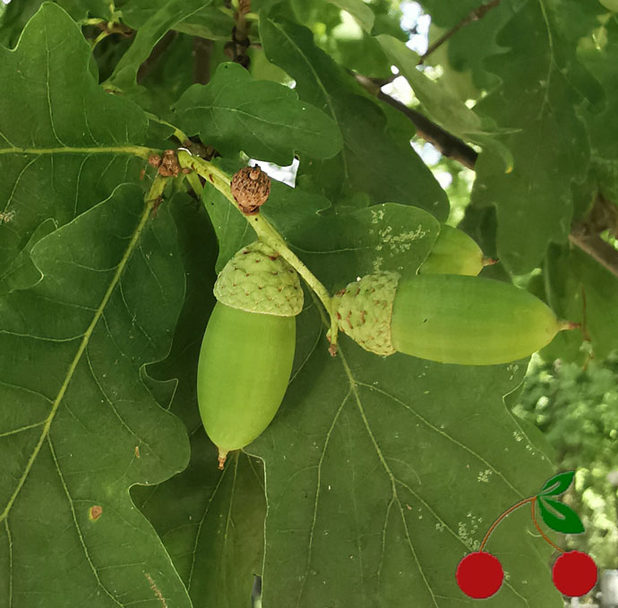 -OWOCE elipsoidalnego kształtu, w półokrągłych miseczkach, zebrane po 2-3 na długich szypułkach, zielone, po dojrzeniu brązowawe; dojrzewają w połowie września